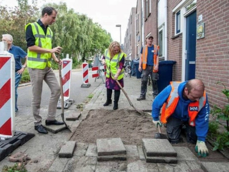 Wethouder Hillebrand Bredemeijer gaf met Annenieke Knoester, voorzitter Wijkberaad Nieuw Waldeck, het startschot voor het opknappen van de buitenruimte in Loosduinen.