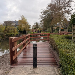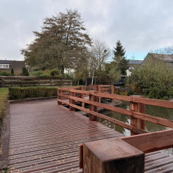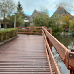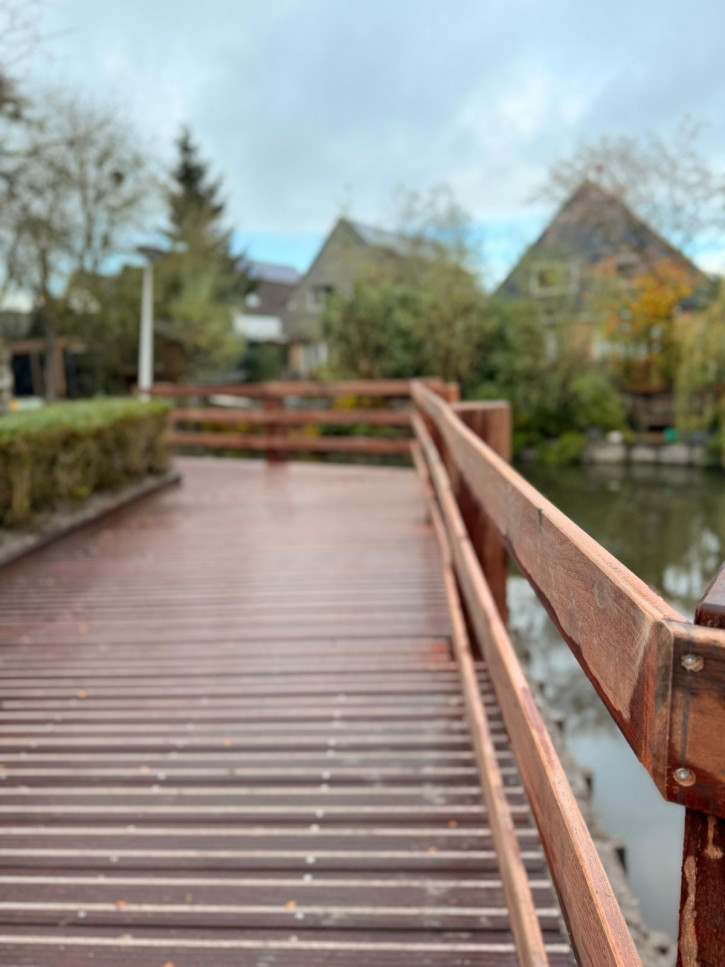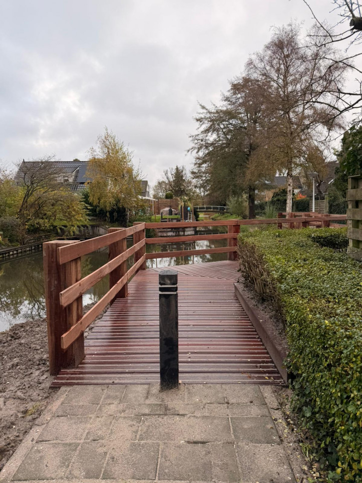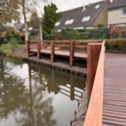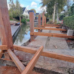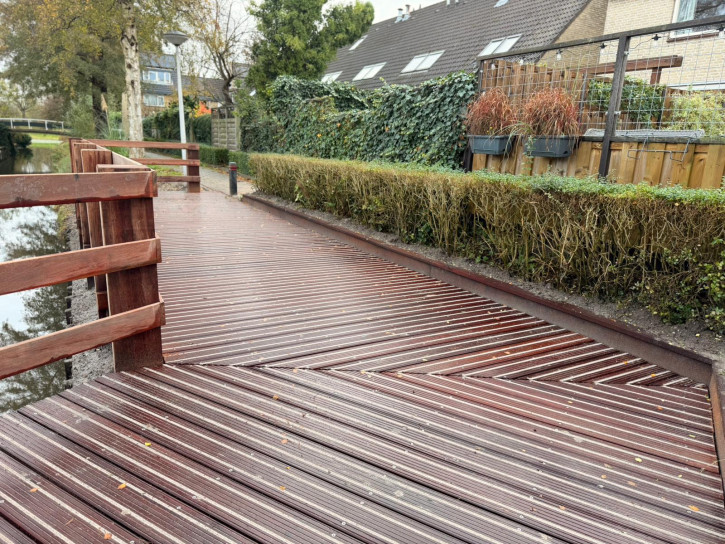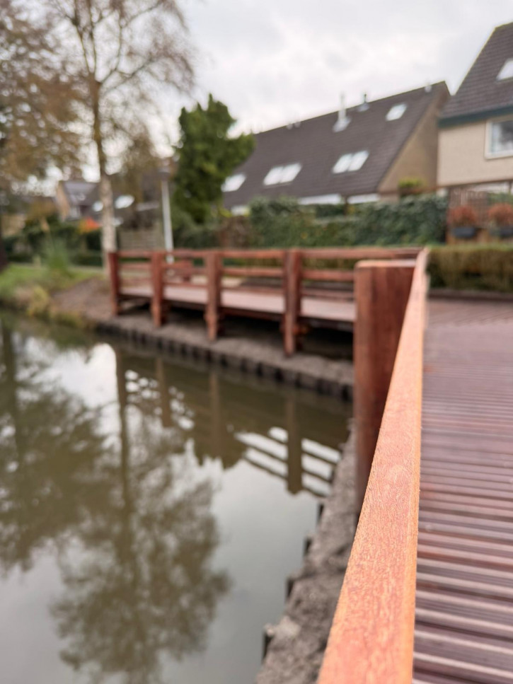 Ook de leuning is grondig aangepakt: meerdere plekken met houtrot zijn vervangen door nieuw, kwalitatief hout. Daarnaast is de volledige onderconstructie vernieuwd. De werkzaamheden zijn uitgevoerd vanaf pontons, waardoor we de omgeving en omwonenden tot een minimum hebben belast.